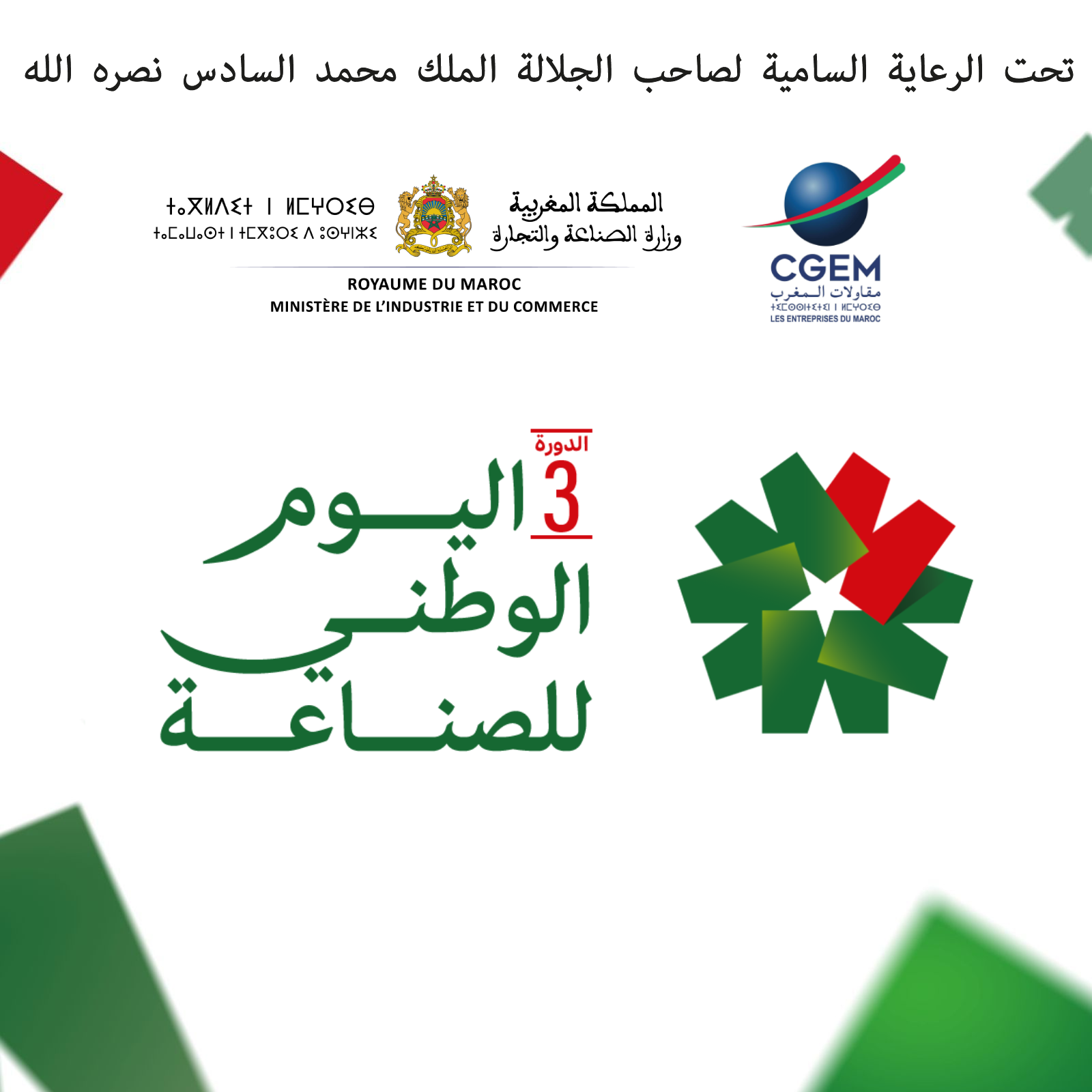 تحت الرعاية السامية لصاحب الجلالة الملك محمد السادس، نصره الله، تنظم وزارة الصناعة والتجارة والاتحاد العام لمقاولات المغرب الدورة الثالثة "لليوم الوطني للصناعة"، وذلك يومي 3 و4 نونبر 2025 بمدينة الرباط، تحت شعار: "علامة صُنع في المغرب: ضمانة الجودة، والقدرة التنافسية، وآلية للتنمية المجالية المندمجة."