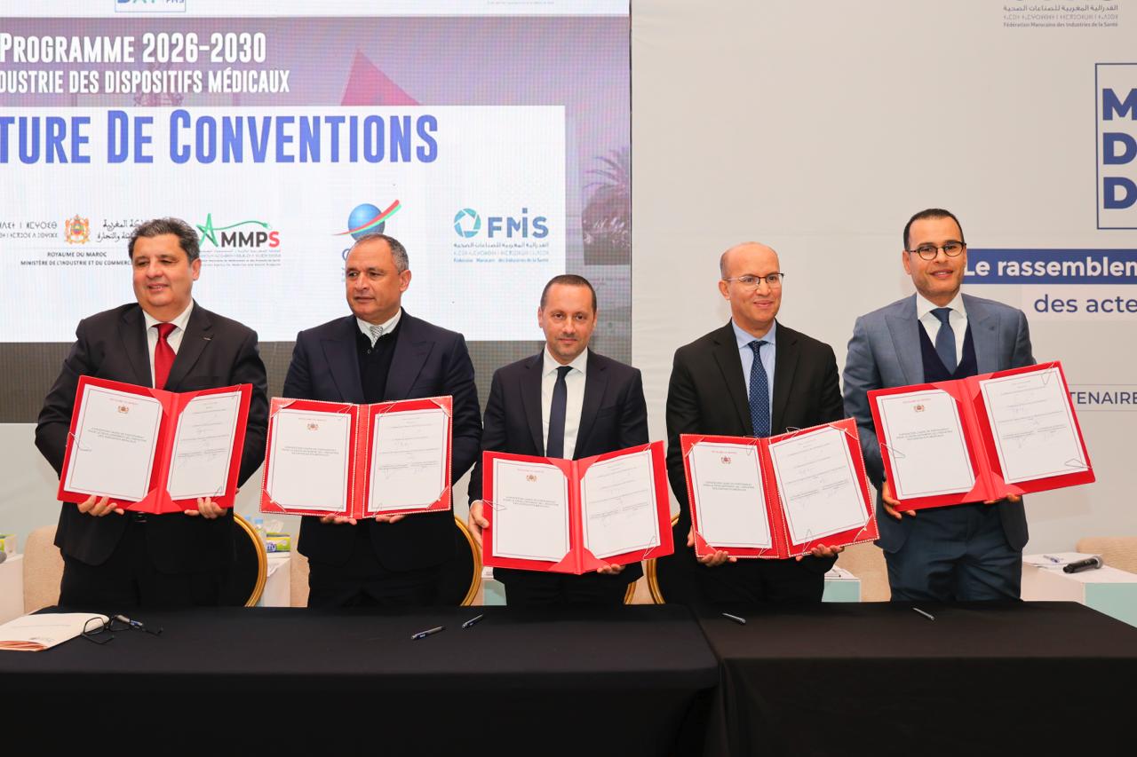 بمناسبة النسخة الثانية من (Medical Device Day) التي نظّمتها الفيدرالية المغربية لصناعات الصحة، يوم الأربعاء 4 فبراير 2026، وقّع كلٌّ من وزير الصحة والحماية الاجتماعية، ووزير الصناعة والتجارة، والمدير العام للوكالة المغربية للأدوية والمنتجات الصحية، ورئيس الاتحاد العام لمقاولات المغرب، ورئيس الفيدرالية المغربية لصناعات الصحة، اتفاقية إطار تغطي الفترة 2026-2030 لتطوير صناعة الأجهزة الطبية بالمغرب.