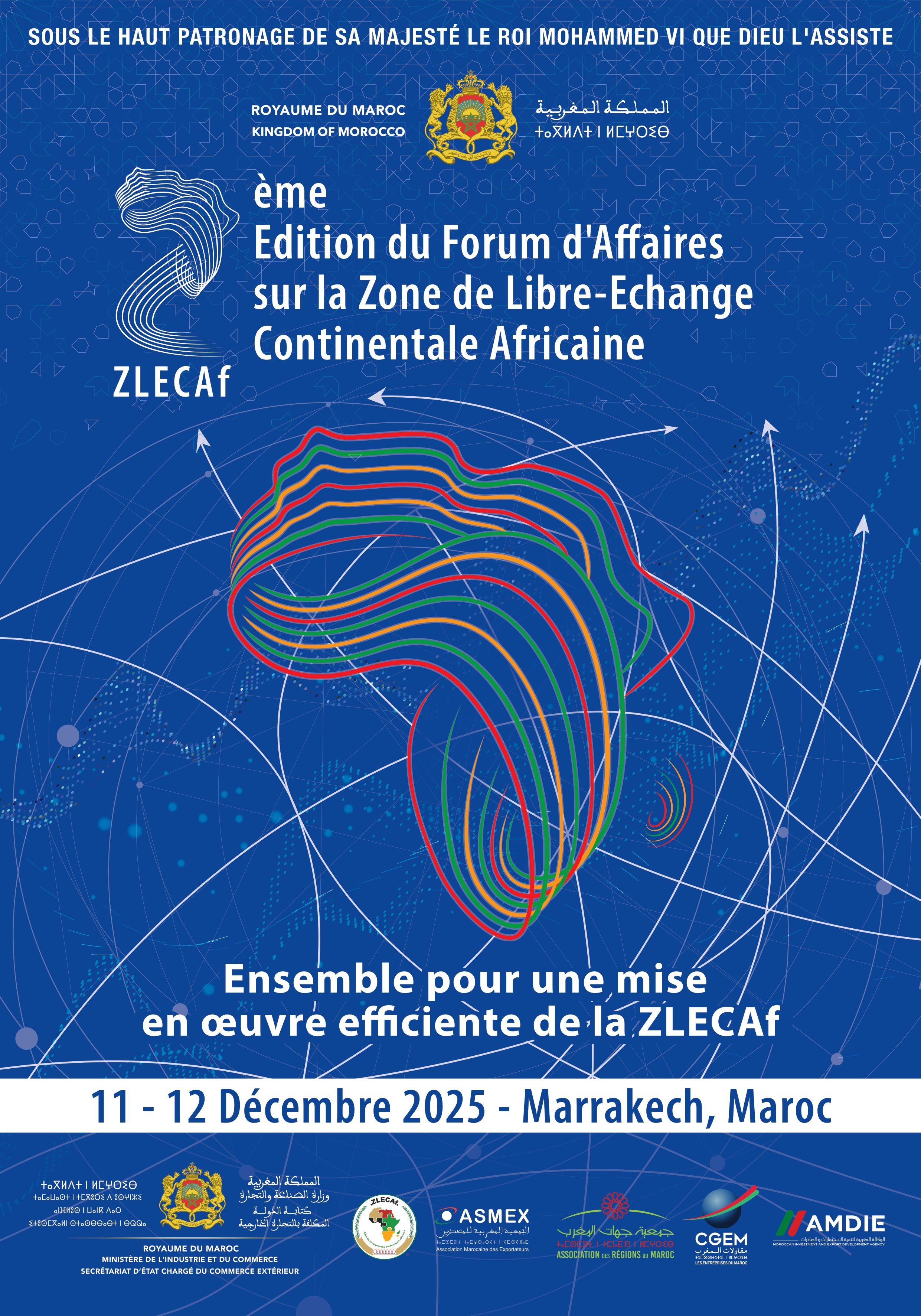 Sous le Haut Patronage de Sa Majesté le Roi Mohammed VI, que Dieu L'assiste, le Secrétariat d’État Chargé du Commerce Extérieur organise la 2ème édition du Forum d’Affaires de la Zone de Libre Échange Continentale Africaine (ZLECAF), les 11 et 12 décembre 2025, à Marrakech, sous le thème : « Ensemble pour une mise en œuvre efficiente de la ZLECAF », en partenariat avec la ZLECAf, la confédération Marocaine des Exportateurs, la Confédération Générale des Entreprises du Maroc et l’Association des Régions du Maroc.
