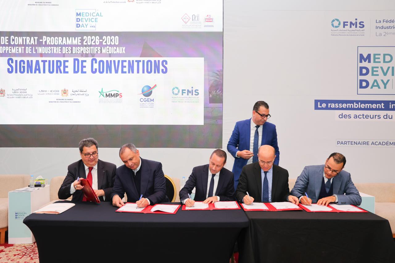 بمناسبة النسخة الثانية من (Medical Device Day) التي نظّمتها الفيدرالية المغربية لصناعات الصحة، يوم الأربعاء 4 فبراير 2026، وقّع كلٌّ من وزير الصحة والحماية الاجتماعية، ووزير الصناعة والتجارة، والمدير العام للوكالة المغربية للأدوية والمنتجات الصحية، ورئيس الاتحاد العام لمقاولات المغرب، ورئيس الفيدرالية المغربية لصناعات الصحة، اتفاقية إطار تغطي الفترة 2026-2030 لتطوير صناعة الأجهزة الطبية بالمغرب.