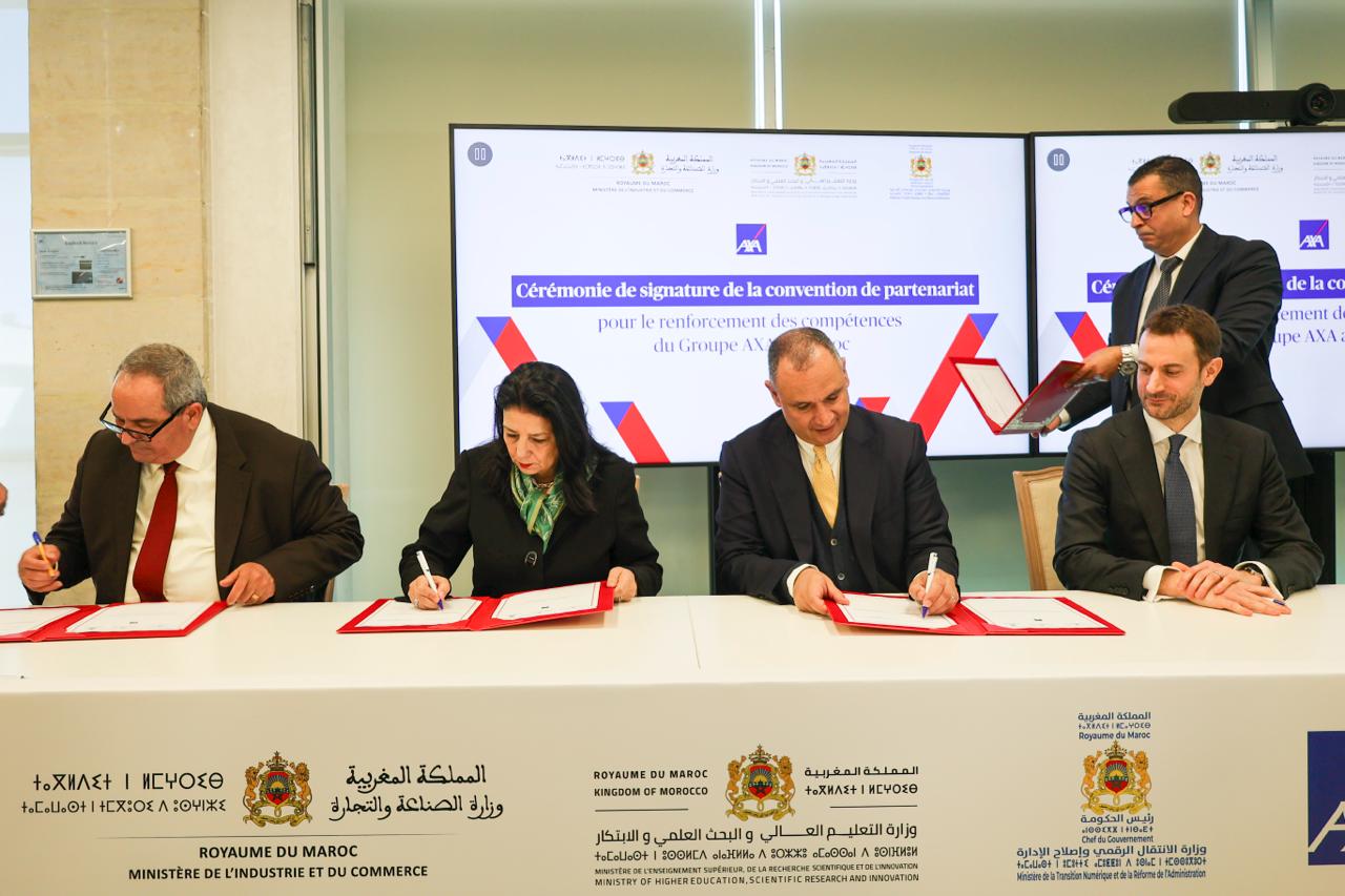 أشرفت وزارة الصناعة والتجارة، ووزارة التعليم العالي والبحث العلمي والابتكار، ووزارة الانتقال الرقمي وإصلاح الإدارة، اليوم بالرباط، على توقيع اتفاقية شراكة مع مجموعة AXA، بهدف إرساء إطار تعاون منظم يروم تعزيز الكفاءات الوطنية في مجالات التكنولوجيا والبيانات والذكاء الاصطناعي.