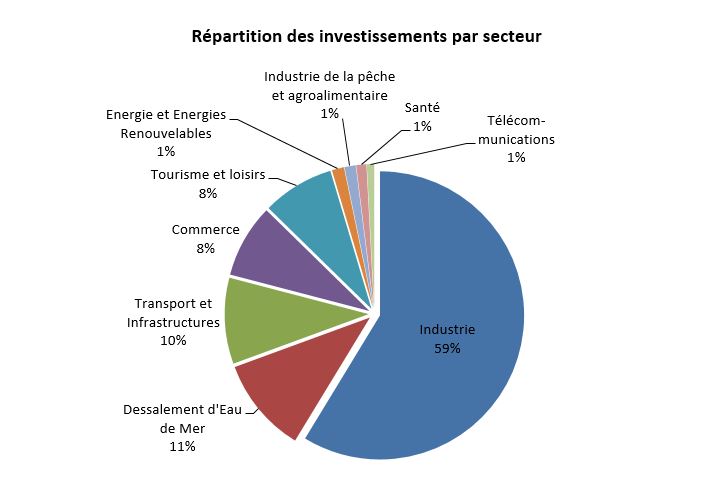 La répartition sectorielle des investissements fait ressortir la prédominance du secteur de l’industrie avec 59% des investissements projetés, soit 18,97 milliards de dirhams.