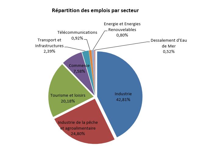 Le secteur de l’industrie de la pêche et agroalimentaire occupe la 2ème position avec 1 535 emplois, soit 24,80% des emplois prévus, suivi du secteur du tourisme et loisirs avec 20,18% des emplois projetés, soit 1 249 emplois directs.
