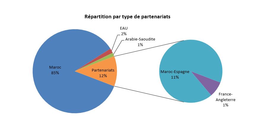 Les joint-ventures arrivent en seconde position avec 12% du total des montants. Elles rentrent dans le cadre de la mise en œuvre de grands projets dans les secteurs du dessalement d’eau de mer et des énergies renouvelables.