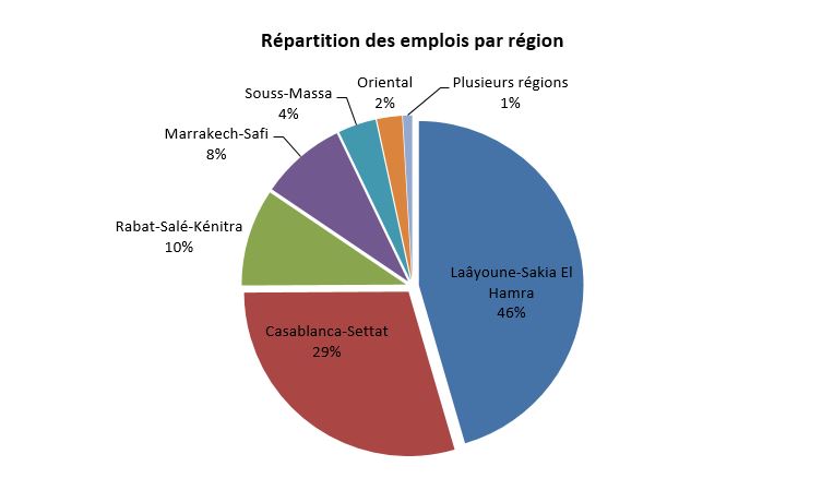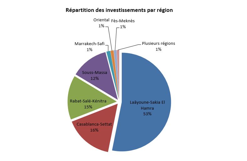La ventilation des projets selon leur région de localisation place les projets de la région de Laâyoune-Sakia El Hamra en 1ère position, aussi bien en termes du montant des investissements (17,18 milliards de dirhams, soit plus de la moitié des investissements) qu’en termes de création d’emplois (46% des emplois directs, soit 2 815 emplois).